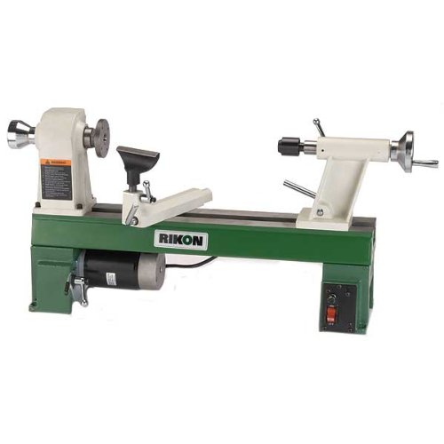 Finally, a quality variable speed lathe at an affordable price. The New RIKON 1216 Variable Speed Mini Lathe is a true workhorse and offers a range of features that rival the much more expensive variable speed lathes. The powerful 1/2 HP DC motor speed is controlled by selecting one of three belt pulley positions and simply turning the dial to your desired speed. Your choice of three speed ranges (300-700, 700-1500, 1500-3350) allows you to adjust for cutting, sanding, buffing and curing finish with ease. Includes 1/2 HP Max, 120 V motor, 4 tool rest, spur center, 3" face plate, tool rest base, live center and instruction manual.
